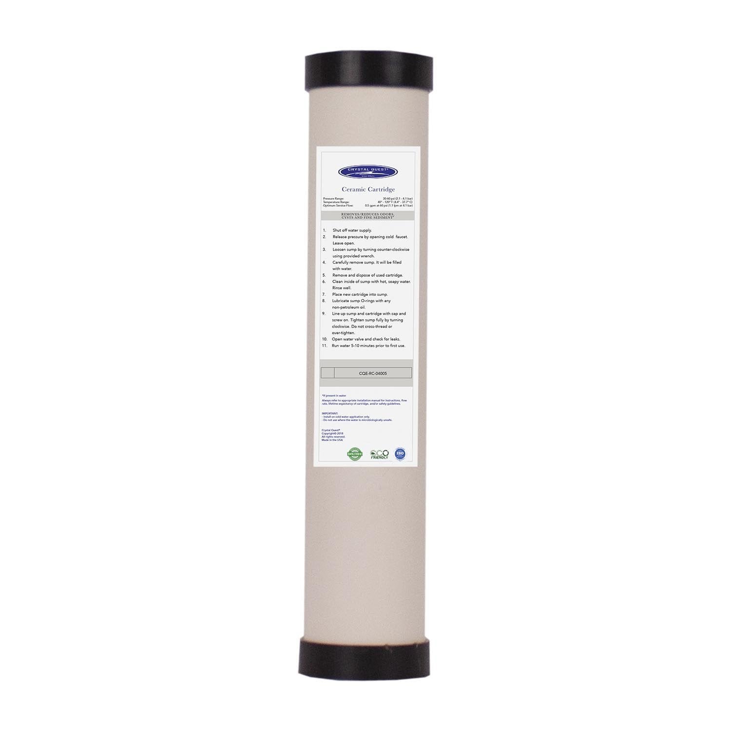 Crystal Quest® Ceramic Filter Cartridge removes Escherichia coli (E. coli), fecal coli form, Salmonella, Streptococcus, cysts, sediment, and asbestos. These filters have a 0.5-micron rating. They may also be cleaned up to 30 times (about once a month) by soaking in either a 50/50 hydrogen peroxide and water mix or a 50/50 white vinegar and water mix.